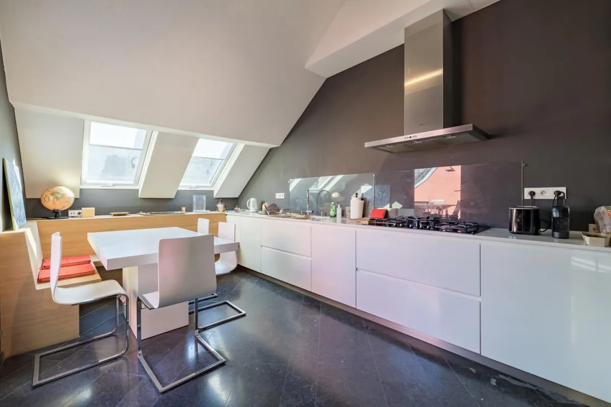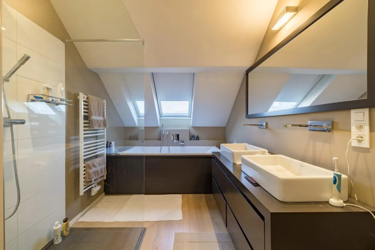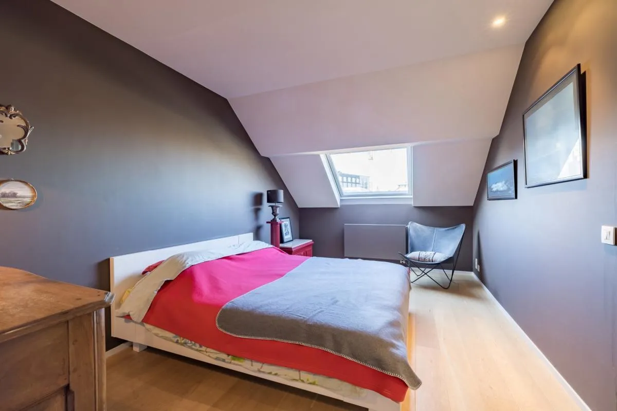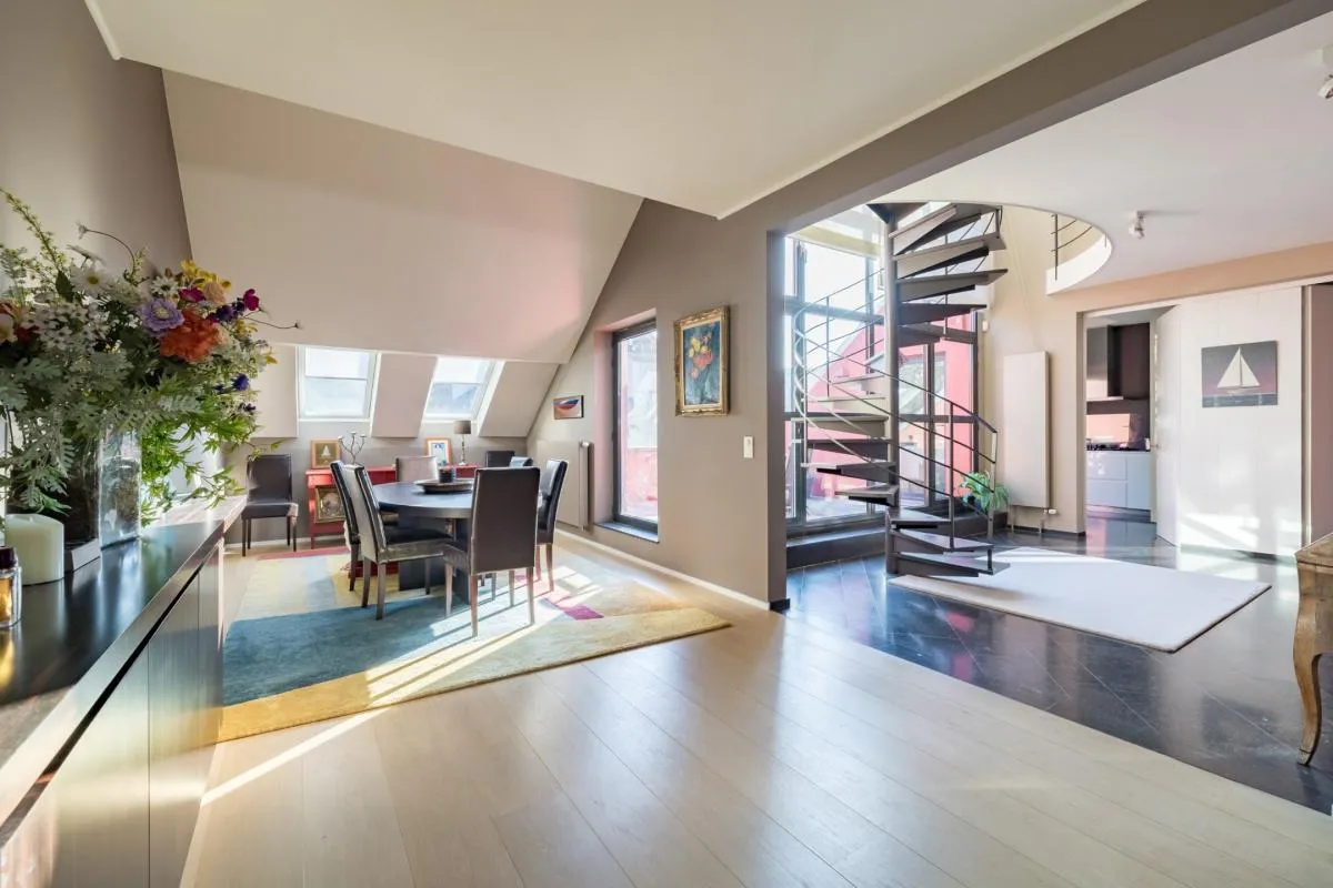 In the Louise district near Place Stéphanie, in a beautiful maison de maître, magnificent duplex penthouse of +/- 208 m2 + terrace of +/- 14 m2 on the 3rd and 4th floors. Renovated in 1993 by architect Joël Claisse. Large reception room, fully equipped kitchen, 3 bedrooms, 2 bathrooms. 2 parking spaces. Cellar.